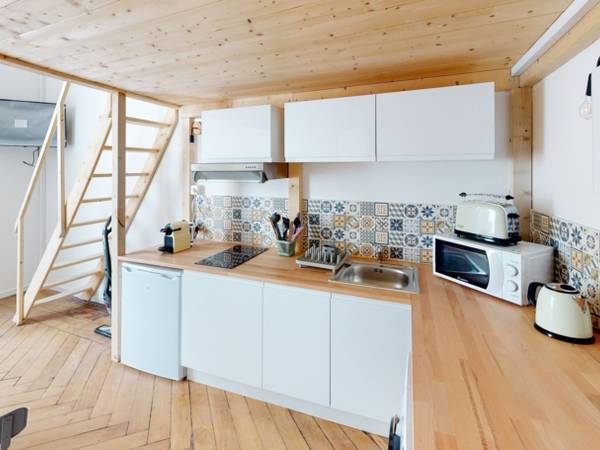 Une cuisine : plaque de cuisson, hotte, micro ondes et frigo Salon/ séjour : Canapé convertible, télé, table basse Salle d’eau : douche, vasque, sèche serviette et machine à laver avec tous les éléments utiles à l’entretien de l’appartement ( aspirateur, serpillère) D'une chambre entièrement décorées et équipées avec : lit double, bureau, penderie
