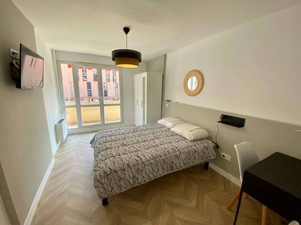 A louer chambre complète de 14.30 m² dans colocation, avec dans la chambre, sa salle de bain, un lit Bultex 140, une télévision écran plat, climatisation, parquet chêne, belle décoration et coin bureau dans la chambre.