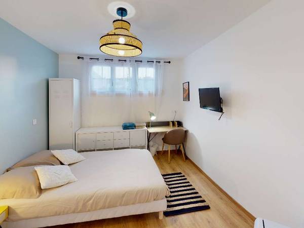 ✨ Votre chambre privée (env. 11 m²) • Lit double 🛏️ • Bureau avec chaise 🪑 • Dressing 👔 • Télévision 🖥️ • Mini-frigo 🧃 • Salle de douche et WC à partagé avec 1 autre colocataire 🚿 • Serrure connectée pour plus de sécurité 🔑