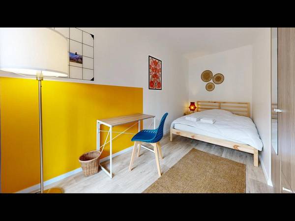 La chambre est tout équipée : lit double avec literie Tediber neuve, armoire, bureau et chaise, bac à linge, tapis, rideaux, volets, décoration etc.