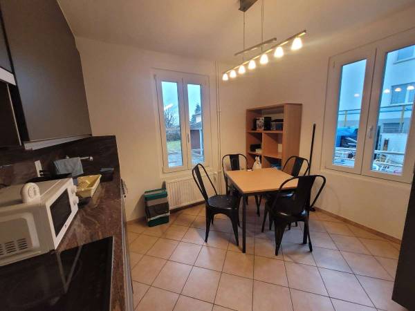3 Salles de bains, une sur chaque pallier. Une cuisine équipée d'un lave-vaisselle, micro-onde et machine à café. Un salon indépendant, permet la conservation du calme dans les chambres. Une buanderie (machine à laver et sèche-linge) est à disposition. Il est demandé une participation de 35.- / personne / mois pour le ménage des communs et taxes poubelles annuelles, il y a un coin recyclage à 5 minutes à pieds.