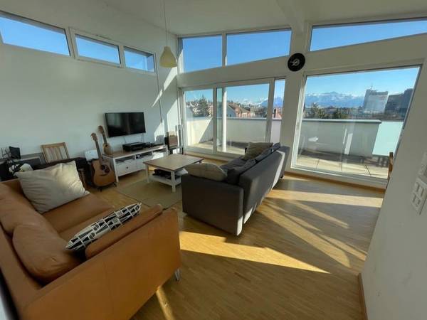 La SDB est partagée avec l’un des colocataires. L’appartement de 4.5 pièces se situe au dernier étage d’un immeuble récent. Il possède une terrasse de 60m2 avec vue sur les Alpes et le Jura. Il est par ailleurs tout équipé avec lave-vaisselle, lave-linge et sèche-linge. La localisation est idéale : arrêt bus 17/19 pour Lausanne à 2min, gare de Renens et M1 à 5 min, Migros/Coop et commerces à 3 min. Si tu es intéressé(e), tu partageras l’appartement avec Vincent et Nicolas. Ils ont la vingtaine, sont sportifs mais n’oublient pas d'être bon vivants. Nous recherchons ainsi une personne qui soit déjà dans la vie active et dans les mêmes âges, qui soit indépendante mais qui aime aussi participer à la vie de la colocation. Cette personne devra apparaître sur le bail (pas de sous-location). Le loyer est de 850 CHF/mois + les charges qui sont d’environ 150 CHF/mois (femme de ménage 1 fois/ 2 semaine, internet, électricité, serafe etc.). Plus d’infos par MP.