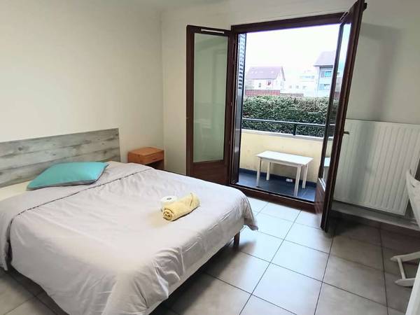 COLOCATION : GRANDE CHAMBRE MEUBLEE, BALCON, POUR 1 SALARIE. 3 autres colocs (2 hommes et 1 femme). Chambre: grand lit, grande armoire bureau et penderie, chevet, balcon . Parties communes: cuisine neuve équipée et aménagée, télévision. Wc séparés, salle de bain. Wifi (fibre) gratuit. Machine à laver dans l'appartement. Commerces et bus à proximité. Situé à 10 minutes à pied du centre ville, 15 minutes à pied du lac. Bus depuis la gare: bus 1. Possibilité de parking priv: 20 euros en plus