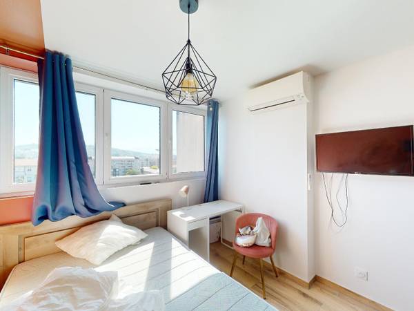 🛋LES ESPACES COMMUNS Cet élégant appartement, situé au 7ᵉ étage, présente une disposition comprenant une entrée qui dessert la première chambre et l'espace de vie principal. La pièce de vie est équipée d'une cuisine fonctionnelle avec deux réfrigérateurs, un four encastré, des plaques de cuisson, deux machines à laver, un four à micro-ondes, une cafetière, un robot pâtissier, une table haute avec six tabourets, ainsi qu'un accès au balcon. Il y a également un coin salon avec un spacieux canapé, une télévision murale, une table basse et trois fauteuils. Le couloir offre de généreux espaces de rangement. L'appartement comprend également quatre salles de bains pour accompagner ses cinq chambres. Cette résidence propose des équipements de qualité et est parfaitement adaptée aux jeunes professionnels à la recherche d'un logement de standing.