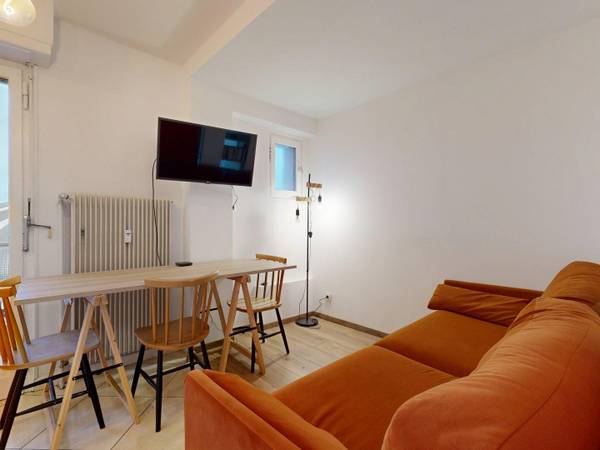 La pièce de vie est meublée avec un canapé, une table à manger avec des chaises ainsi qu'une télévision. Elle donne également accès à un balcon qui vous permettra de gagner en espace et en confort.