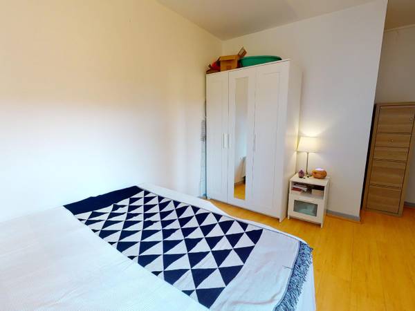 On aime le parquet stratifié jaune qui ajoute une touche de couleur. La chambre donne sur l’espace arboré de la résidence et n’a, de fait, aucun vis-à-vis.