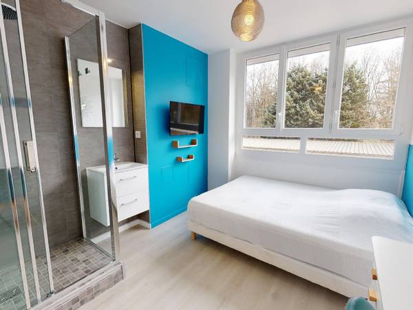 📷VISITE VIRTUELLE DISPONIBLE SUR DEMANDE 📷 🏠LE LOGEMENT Belle colocation meublée à Bron, à la frontière avec Lyon 8e : 76 m2 pour 5 chambres. Situé au 1er étage du 31 rue du Parc. L’appartement a été entièrement refait à neuf dans un esprit moderne : parquet stratifié clair pour la luminosité, chaque chambre possède un pan de mur coloré et une grande baie vitrée. 🛏️LA CHAMBRE La chambre 1, dit la chambre bleue, dispose d’une salle de bain privative (cabine de douche et lavabo). Naturellement, on trouve un lit deux places, un bureau, un grand placard. Un écran suspendu, idéal pour mater des séries, et des étagères murales complètent le mobilier. La pièce est lumineuse et donne sur les parkings de la résidence d’une part et le bois des Essarts d'autre part, elle est donc particulièrement calme. 🛋️ESPACES COMMUNS Ce T6 s’organise autour de la pièce de vie centrale réunissant la cuisine entièrement équipée et le salon. 3 des chambres disposent de leur propre salle de bain ce qui fait que l’usage de la salle de bain dite commune est partagé entre deux colocataires seulement. On trouve deux toilettes, l’un dans la salle de bain, l’autre séparé. A noter que les chambres ferment à clef.L’espace salon est cosy, petit mais suffisant pour profiter de la vie en coloc. 🏙️CADRE DE VIE l’appartement est à seulement 400 m du métro D et du tram T6 (arrêt Mermoz Pinel), du Bois des Essarts et du Parc de Parilly. Bellecour est donc accessible en moins de 20 minutes, comme les hôpitaux de l’est lyonnais (Vinatier, Desgenettes, Edouard Herriot, Louis Pradel, etc.). Il est très facile de se garer aux alentours de l'immeuble et le stationnement est gratuit, à commencer par le parking des galeries Lafayette. TRANSPORTS 🚇 Métro D ( Mermoz Pinel) 🚊Tram T6 (arrêt Mermoz Pinel 🚌 Bus au service renforcé : C8 /C9/C17/ 7/24/25 (Dans un rayon de 300m) 🚴🏻♂️ Stations Vélo’v dans un rayon de 200 mètres. 💡SERVICES ET ÉQUIPEMENTS INCLUS Chauffage Gaz Eau courante Eau chaude Electricité Internet (Fibre) Entretien de l’immeuble Taxe ordures ménagères Gardien Abonnement Netflix Ménage des parties communes de l'appartement (passage toutes les 3 semaines) Machine à laver