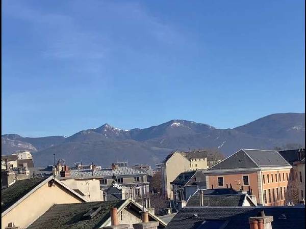 Grand balcon lumineux avec vue sur les montagnes - ma chambre est au dernier étage de la coloc en duplex - dispose d'un lit neuf et meublé d'un bureau ainsi que d'une penderie.