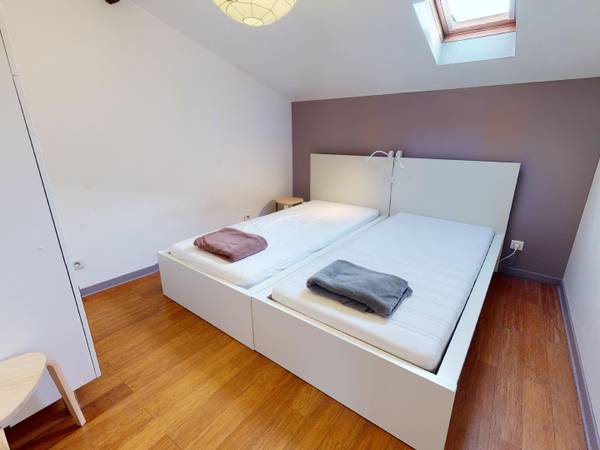 🛏️LA CHAMBRE Surface : 12m² Équipements : deux lits simples (un lit double va être installé) et un placard de rangement. Le bureau se trouvant dans les parties communes (à droite).