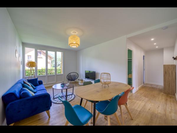 L'appartement se situe au RDC, il est traversant et bénéficie d'une exposition Est/Ouest. Il se compose d'une belle cuisine très bien équipé, d'un salon cosy, d'une salle de bain avec loggia, et de 4 chambres entièrement équipées (bureau, penderie, lit, couverture, oreillers, draps & serviette de douche) et d'un WC séparé. L'appartement possède la fibre.