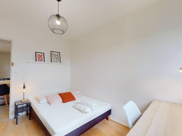 🏠 LES PARTIES COMMUNES Cette colocation de quatre chambres s'ouvre sur une spacieuse pièce de vie comprenant un coin cuisine et un coin séjour. Le séjour est aménagé avec soin, offrant un canapé confortable, une table basse, un fauteuil ainsi qu'une table et six chaises, parfait pour des moments conviviaux entre colocataires. La cuisine est entièrement équipée avec un four, des plaques de cuisson et une hotte, une machine à laver séchante, un lave-vaisselle, un réfrigérateur avec congélateur, un micro-ondes ainsi que de nombreux espaces de rangement, offrant ainsi tout le nécessaire pour préparer de délicieux repas. La salle de bain, avec toilettes séparées, est équipée d'une douche, d'un porte-serviettes radiateur et d'un meuble double vasque avec un grand miroir, offrant confort et praticité aux résidents. De plus, l'appartement dispose de rangements dans l'entée offrant des espaces supplémentaires, idéal pour organiser vos affaires personnelles.