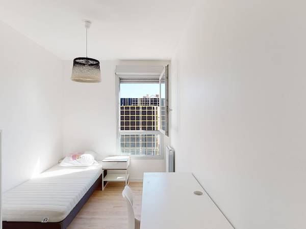 LE LOGEMENT Grande colocation de 3 chambres de 68m2 est située au dans le 8ème arrondissement de Lyon au 4 Place Julien Duret.L’appartement est très moderne et lumineux grâce aux grandes fenêtres présentes dans la pièce de vie. 🛏️LA CHAMBRE Superficie : 10m2 La chambre 1 de 10m2 est située à proximité de l’entrée de l’appartement. Cette chambre est toute en longueur et se compose d’un lit simple, d’une commode avec étagère et portant, d’un bureau et d’une chaise. 🛋️ESPACES COMMUNS Cuisine équipée et fonctionnelle Coin salon Coin repas Balcon 1 Salle de bain WC séparé