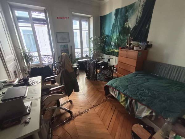 Il y a 2 salles de bain. 1re chambre : Elle fait environ 20m² et possède une immense penderie. Elle donne sur une rue calme perpendiculaire à la rue de la république.