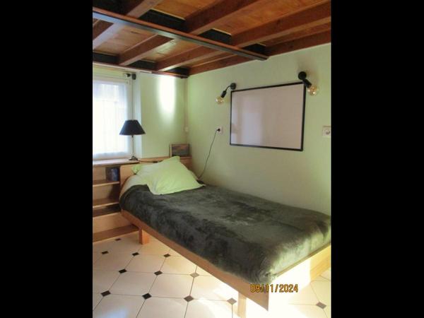 Équipement : - Chambre : 1 lit 1 pers. (90 x 200) avec sa literie + 2 placards-penderies avec cintres + 2 rangements étagères-bibliothèque + rangement sous lavabo + table ovale et ses 2 chaises + lampe de chevet et 3 appliques au mur + 2 tableaux blancs pour affichage + corbeille à papier + nécessaire ménage et produits d'entretien + étendoir et pinces à linge. - Salle de bains-buanderie en partage : baignoire (eau chaude à volonté) + sèche-cheveux + fer à repasser + lave-linge (1 utilisation par semaine). - Cuisine-séjour en partage pour le stockage des aliments, la préparation et la prise des repas : réfrigérateur avec compartiment congélateur 4* + cuisinière mixte + bouilloire + cafetière manuelle + ustensiles de cuisine + vaisselle-verres-couverts + espace de stockage + table et chaises. - Terrasse sur jardin en partage : table et chaises + fauteuils + transat + parasol.