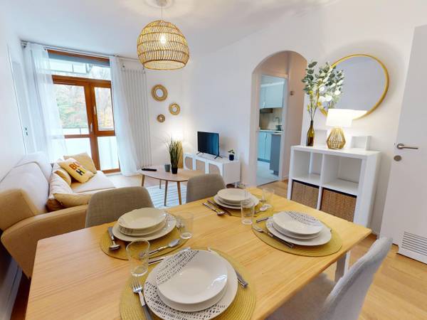 La colocation a été entièrement rénovée et meublée à neuf fin 2024. La pièce de vie est meublée avec canapé, tapis et table basse gigogne, TV et meuble TV ainsi qu'une table à manger 4 personnes. Elle est agréablement décorée. Le séjour donne également sur un balcon, idéal pour les jours d'été. La cuisine séparée est équipée d'un four, de plaques de cuisson, d'une hotte, d'un évier, d'un réfrigérateur avec compartiment congélateur, lave-vaisselle, micro-ondes, machine à laver, ainsi que de nombreux rangements et ustensiles de cuisine. Depuis la cuisine, vous pouvez accéder à une pièce annexe (loggia) qui est idéale pour en faire un garde-manger et étendre son linge. Le plus : bouilloire, machine à café, toasteur La salle d'eau comporte une douche, un meuble vasque avec miroir, sèche-serviette ainsi que des rangements. Les WC sont séparés.