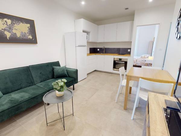 🛌LA CHAMBRE La chambre 3 lumineuse est aménagée avec un bureau, une chaise et un placard de rangement intégré. Le lit double (sommier Bultex) quant à lui se trouve en mezzanine. 🛋LES ESPACES COMMUNS Les parties communes de cette colocation comportent un canapé, une table basse, une TV et une table à manger ainsi qu’une cuisine ouverte. La cuisine est équipée avec un four, des plaques de cuisson, un micro-ondes, un frigo, des rangements, etc. Une salle de bain avec douche, meuble vasque et machine à laver ainsi que des WC séparés vient compléter ce logement. Il possède un chauffage individuel électrique. Il bénéficie également de la fibre, pour une connexion haut débit. Il est situé au premier étage d'un immeuble.
