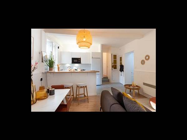 🏠 L'APPARTEMENT Cet appartement a été entièrement rénové début 2023 pour offrir un cadre de vie moderne et chaleureux dans un esprit coliving. La pièce de vie principale se compose d'un salon cosy avec un canapé, un pouf et une large table basse, s'ouvrant sur une cuisine américaine parfaitement agencée. Cet espace dispose d'un comptoir avec tabourets de bar, de nombreux rangements et d'un équipement complet incluant un lave-vaisselle, un four, un micro-ondes et un réfrigérateur avec un grand compartiment congélateur. La distribution du bien permet d'accéder à une première chambre depuis le séjour, tandis que deux marches mènent à un couloir desservant les deux autres chambres ainsi qu'une salle de bain équipée d'une machine à laver. Le chauffage et la production d'eau chaude sont assurés par des équipements performants pour garantir un confort optimal toute l'année.