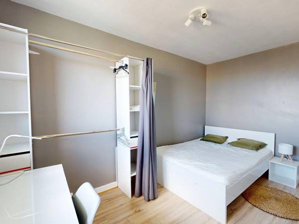 🛏️ LA CHAMBRE Elle est équipée d'un lit (double), bureau, placard de rangement et commode de chevet.