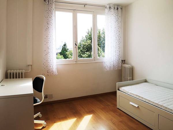 La chambre qui se libère est la n 3, d'environ 12 m2. Elle est équipée d'un lit transformable en LIT DEUX PLACES, (140 x 200) Un placard avec étagères et penderie, deux grands tiroirs de rangement sous le lit un bureau, une chaise de bureau, une lampe, une poubelle de bureau, un grand miroir. La grande fenêtre de la chambre donne au sud sur un grand parc privatif réservé à la résidence, dont vous pourrez profiter.