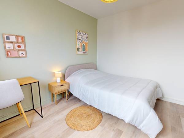 LES ESPACES COMMUNS Cette colocation entièrement rénovée avec goût est agencée comme suit : Une pièce de vie meublée avec canapé, tapis, tables basses gigognes, TV et meuble TV, table à manger 4 places. Un balcon accessible depuis le salon, donnant une vie dégagée sur l'extérieur Une cuisine, séparé du salon, mais pas fermée et équipée avec four, plaque de cuisson gaz, frigidaire, machine à laver, lave-vaisselle Une salle d'eau avec douche, meuble double vasque, et WC Les chambres viennent compléter cet appartement rénové. Il est situé au 3e étage d'un immeuble.
