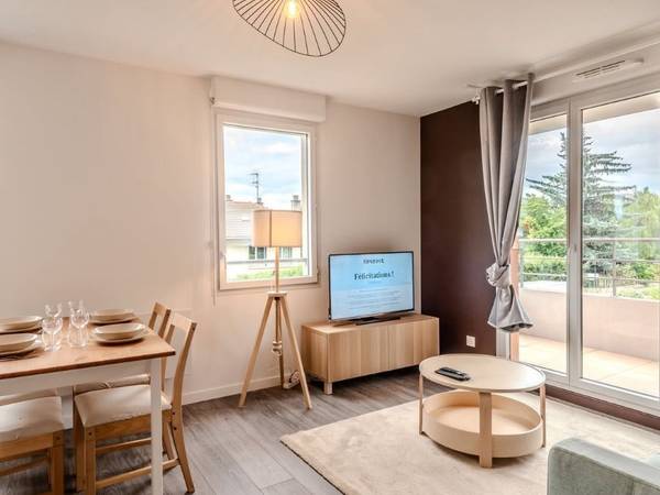 Salon cosy : Canapé confortable, Grande TV HD, accès direct au balcon pour profiter des beaux jours.