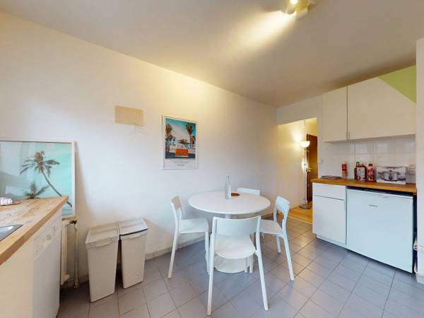 🏠 LE LOGEMENT L’appartement s’ouvre sur une cuisine spacieuse et lumineuse, aménagée avec un coin repas comprenant une table ronde et des chaises. La cuisine dispose de nombreux rangements, d’un plan de travail en bois et d’un équipement complet : plaques de cuisson, four, micro-ondes, lave-linge et lave-vaisselle. Une large fenêtre apporte une belle luminosité à la pièce. Chaque locataire bénéficie de son propre réfrigérateur ainsi que d’un espace de rangement individuel identifié par un code couleur.