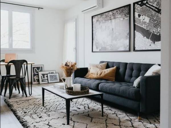 🛋 Salon climatisé avec balcon spacieux : Canapé 3 places Télévision 120cm/ meuble tv Table basse Grande table à manger + 4 chaises Fauteuil/ pouf/ grand tapis Prise Fibre