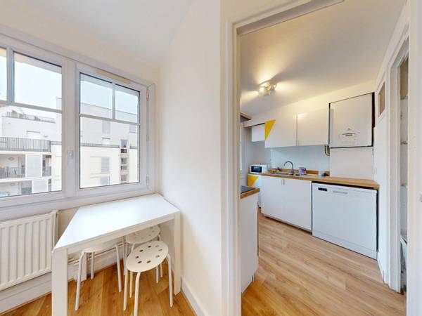 🏠 LE LOGEMENT La colocation s’articule autour d’une cuisine lumineuse et fonctionnelle, équipée d’un four, d’un micro-ondes, d’un lave-vaisselle et d’une plaque de cuisson. Vous disposez également de votre propre réfrigérateur ainsi que d'un espace de rangement individuel via un système de couleur. Un coin repas est installé près des fenêtres, apportant une belle clarté à la pièce. La salle d’eau, entièrement carrelée, dispose d’une douche moderne, d’un meuble vasque avec miroir et d’un lave-linge installé dans un espace dédié avec étagères de rangement.