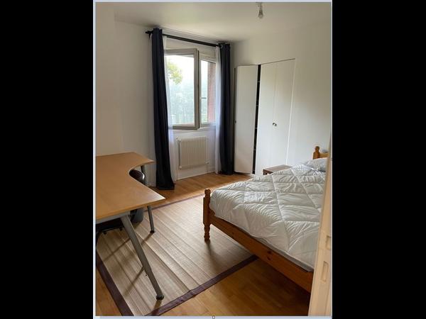 Loue chambre de 12 m2 dans appartement de 72 m2 refait totalement à neuf. La chambre dispose de toutes les commodités avec lit de 140, bureau, armoire, table de chevet, lampe de chevet etc. Fenêtres double vitrage phonique mais aucun bruit, la chambre donne sur le parc de la copropriété donc extrèmement calme. L'appartement possède deux salles d'eau dont une privative et toutes les commodités. L'appartement est situé pas loin de l'INSA. Le bus 69 est à moins de 30 mètres. Il dépose à L’INSA en cinq minutes. À pied il faut une vingtaine de minutes. Mais possibilité de garer un vélo dans l'allée. Parking et grand parc à l'intérieur de la copropriété. Location 565 + 30 euros de charges.