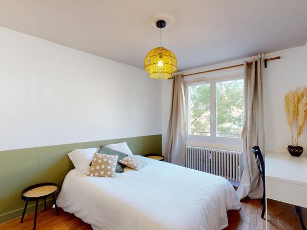 🛌 LA CHAMBRE La chambre 3 se compose d'un lit double, d'un bureau, de deux tables de chevet et d'une commode de rangement. 🏠 LES ESPACES COMMUNS L’appartement se compose d’une cuisine indépendante, d’un séjour, d’une salle d’eau commune, d’un WC indépendant ainsi que de quatre chambres. La cuisine est très bien équipée (Four, frigidaire, plaques de cuisson, hotte, rangements, etc.), et dispose d’une machine à laver et d’un lave-vaisselle. Le salon a été agencé avec du mobilier de goût et se compose d’un canapé, d’une table basse, d’un tapis, d’un meuble TV, d’une TV, d’une lampe et d’un espace salle à manger muni d’une table avec plateau en marbre et un banc d’angle. Plusieurs éléments de décoration et plantes viennent parfaire ces espaces. La salle de bain commune aux quatre chambres et dispose d’un meuble-vasque, et d’une douche.