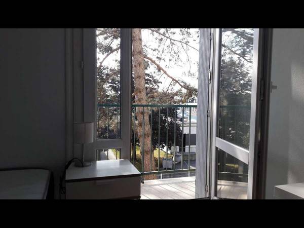 La chambre verte (17m³) est déjà louée par Elise, étudiante de 24 ans en arts plastiques. Elle est orientée à l’ouest et partage un grand balcon commun avec la chambre bleue.