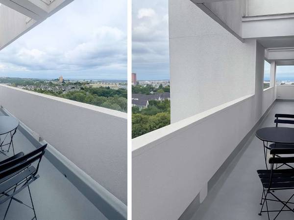 • Un balcon de 38m2 avec vue à 180° sur Saint-Brieuc et la baie de Saint-Brieuc. Le balcon est équipé de tables et chaises, afin que vous puissiez profiter d’un repas avec vue mer.