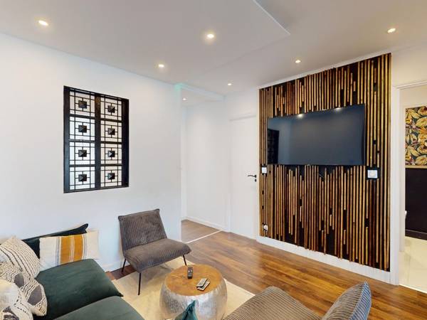Espaces communs modernes et accueillants • Canapé et fauteuils pour vos moments de détente • Cuisine séparée entièrement équipée avec un frigo américain • 2 salles de douche rénovées • 2 WC dont 1 séparé