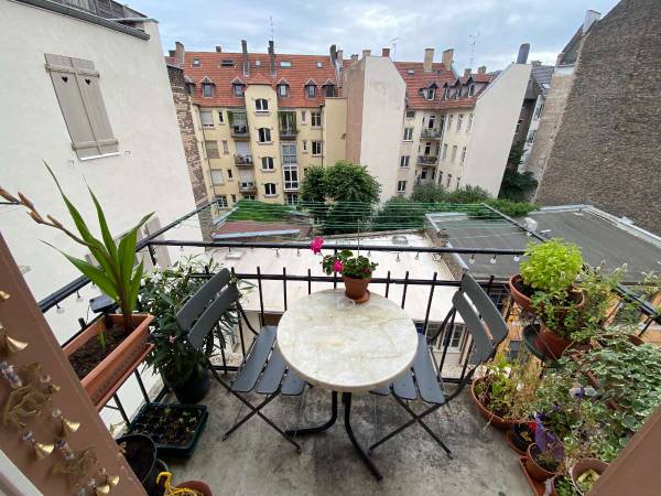 Concernant l'appart : Il est situé dans un immeuble ancien, au 4e étage avec un ascenseur (très) étroit. Il dispose d'une grande cuisine bien équipée avec un balcon, baignée de soleil le matin quand Strasbourg le veut. Le salon est rempli de livres et de vinyles. Il y a aussi une salle de bain vert pomme avec machine à laver... et deux chambres.