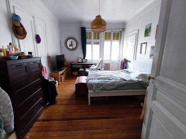 Où : rue de la Broque, 10min de la gare à pied, carrefour express pas loin, arrêt de tram Laiterie/musée d'art moderne L'appart : 140m2, un salon avec plusieurs canap, une cuisine et une salle de bain, toilettes séparées La chambre : 20m2 meublée, lit double matelas quali, TV, un meuble à tiroir pour les vêtements et une bibliothèque (sur photo encore mes affaires présentes mais bien sûr j'enlèverais tout ça) La coloc : ambiance chill où on est tjrs content de papoter ensemble quand on se croise, et où chacun a son petit rythme de vie Les colocs : - Fabio, 30 ans, présent depuis 2 ans, vendeur en boutique de vélo, stocke des vélos dans l'appart et dans sa chambre, aime la techno (et les vélos) - Mathilde, 25 ans, arrivée début janvier, aime sortir, les activités culturelles (ciné, musée) - Rocco, 36 ans, arrivé mi août, aime sortir pour boire un verre ou faire la fête, souvent en vadrouille le WE