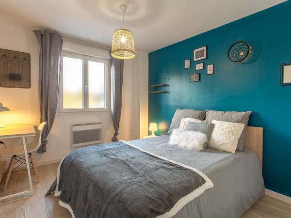 La chambre disponible est située au premier étage, côté cour et mesure 10m2 avec une fenêtre. Elle est meublée d'un lit 140 avec matelas, une table de nuit, un placard à double portes, un bureau avec chaise. Chaque chambre est équipée d'une fermeture à clés sécurisée.