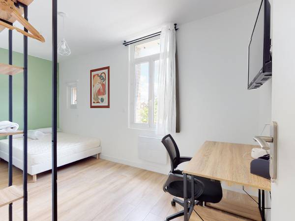 🏠 LES ESPACES COMMUNS La maison a été entièrement rénovée, et comporte trois niveaux. Elle dispose de cinq chambres, chacune disposant d’une salle de bain privative, pour pouvoir profiter des avantages de la colocation tout en conservant son indépendance, ainsi qu’un ensemble de parties communes (Cuisine, salon, cour extérieure) Les parties communes se trouvent au rez-de-chaussée et comprennent une cuisine très bien équipée (Four, micro-ondes, plaques de cuisson, hotte, table à manger, machines à laver, rangements, etc.) et s’ouvre sur un lumineux salon. Celui-ci se munit d’un grand canapé, d’une table basse, d’un tapis, d’un fauteuil, d’un lampadaire, d’un meuble TV et d’une très grande TV murale. Vous accéderez par le salon à une cour extérieure et d’une alcôve agencée avec un salon d’été. Les chambres sont similaires et disposent d’un lit double, d’une table de chevet accompagnée d’une lampe, d’un meuble dressing, d’une TV murale, d’un bureau accompagné d’une chaise et enfin, d’une salle de bain privative munie d’une douche, d’un WC, et d’un meuble vasque.