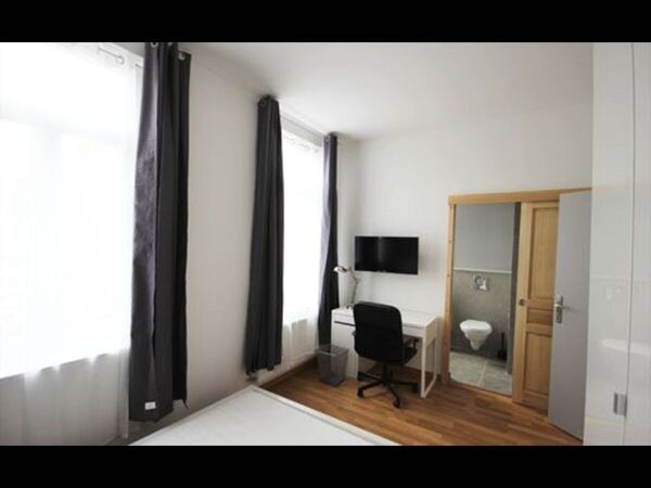 Chambre disponible entièrement meublée : Lit double, bureau, luminaires, rangements, écran plat, TV+Internet Haut Débit, salle de bain privative composée d'une douche, vasque, miroir et wc.
