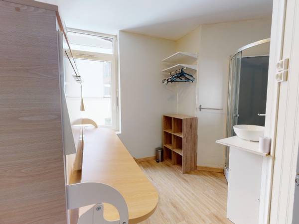 CHAMBRE 2 : Superficie : 9m2 Équipements : son lit double escamotable, sa commode, ses étagères, son meuble vasque et sa cabine de douche privative.