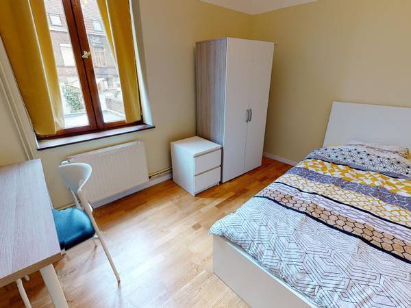 🛏️LA CHAMBRE La chambre 2 de 11m2 située au 1er étage de la maison est lumineuse. Cette chambre est équipée d’un lit simple, d’un bureau, d’une chaise et de rangements. 🛋️ESPACES COMMUNS Les parties communes à la décoration moderne comportent : Un salon lumineux (dont avec canapés & TV) Une cuisine entièrement équipée et semi ouverte sur le salon Une salle de bain WC séparés