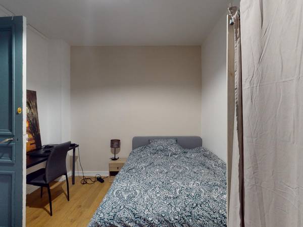 La chambre La première chambre de cette colocation est équipée par un lit double, un bureau et une chaise ainsi qu'un placard de rangement