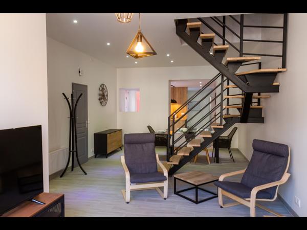 Les espaces communs : Salon et salle à manger confortables avec grande TV, canapé, et mobilier moderne. Cuisine équipée avec tout le nécessaire. Buanderie avec lave-linge et sèche-linge. Cour extérieure avec salon de jardin. Garage pour vélos, avec un vélo disponible. Trois WC, un par étage.