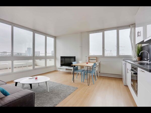 L'appart est au 12ème avec ascenseur, il fait 76m2 avec une petite terrasse, un salon avec cuisine ouverte, 3 chambres, toilettes et salle de bain séparée. Il est entièrement meublé et ta chambre aussi (environ 12-13m2). La résidence est aussi équipée d'un local à vélo sécurisé.