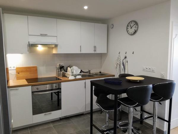 🥕 Cuisine ouverte sur séjour tout équipée 🥕 Table bar avec tabourets, réfrigérateur américain XXL, table de cuisson à induction 4 feux, hotte, four, lave vaisselle, plan de travail, micro-ondes, bouilloire, grille-pain, vaisselle complète, ustensiles de cuisine...
