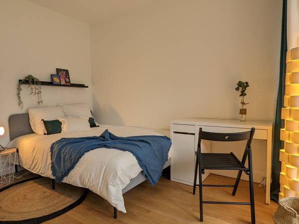 La chambre - Meublée, lumineuse, lit 140x200 cm (avec draps), bureau et rangements - Accès aux pièces communes, internet, chauffage, électricité, eau chaude et assurance inclus dans les charges - Charges comprises, aucune surprise