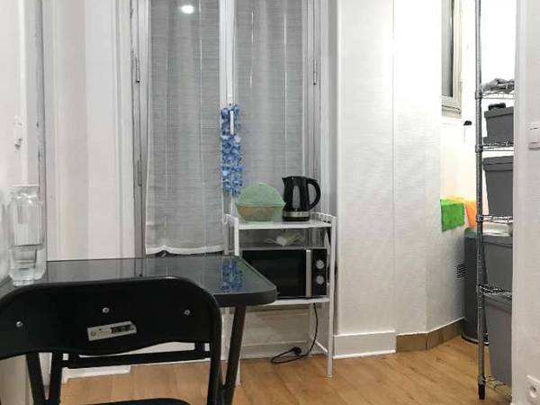 L'appartement est au 1er étage sans ascenseur. Il y a un digicode pour entrer dans le bâtiment. Les fenêtres donnent sur la cour. Le lit est au dessus d'une banquette superposée pour gagner de la place. Il y a tous les équipements nécessaires : machine à laver, douche, micro onde, frigo, four, air fryer, connexion internet fibré, etc...