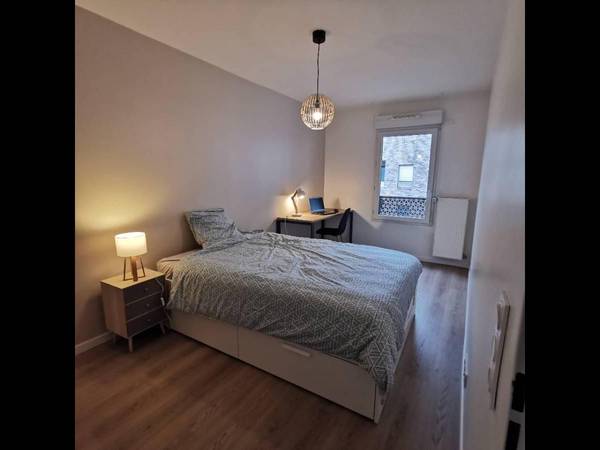 1 chambre de 9 m², équipée de lit de 90 cm et placard (literie neuve), bureau et chaise de bureau. Fenêtre triple vitrage, pas de vis à vis. Loyer: 550€ + 50€ charges soit 600 €/mois charges comprises. Parking (souterrain) possible en option, 40€/mois