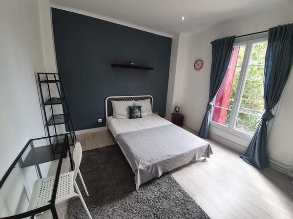 Chambre de 13 m2 donnant sur jardin avec une salle de bain partagé avec un seul colocataire.
