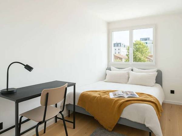 Équipement complet : Un lit double (140x200), un bureau design pour bosser sereinement, une lampe de chevet, une chaise et une armoire spacieuse.