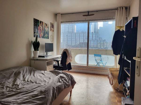 Sur le balcon de la chambre, nous avons une grande vitre qui donne accés au balcon directement depuis la chambre. On peut y voir les tours de la Défense, et il est suffisamment grand pour faire des séances de sport ou stocker d'autres affaires (par ex, un vélo).